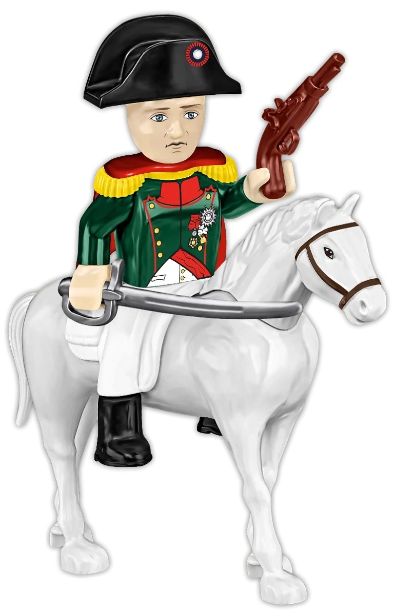 Nowe elementy - Figurka Napoleona posiada zupełnie nowe elementy stworzone specjalnie do serii NAPOLEONIC WARS. W tym zestawie są to czapka Napoleona, epolety, pelerynka, luneta obserwacyjna, oraz wysokiej jakości nowe nadruki odzwierciedlające wygląd elementów ubioru z epoki.